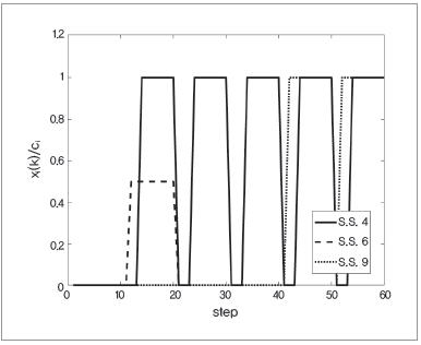 시뮬레이션 결과를 그림 5~그림 7에 나타냈다. 그림 5에서는 이용률이 기존의 알고리즘에 비해 향상되어 있지만, 완전히는 일률적으로 되어 있지 않다. 이것은 서비스 스테이션 SS9에서는 아직 차량이 도착하지 않으므로 당연히 차량을 유입시킬 수 없고, 이용률은 step 10-20 사이에서 0이 되기 때문이다. 그러나 그림 6, 그림 7로부터 슈타켈베르크 게임에 의한 최적 에너지 수요량과 가격이 모두 제약 내에 들어가 있는 것을 확인할 수 있다. 또한, 그림 6에서는 모든 EV에서 제약이 지켜지고 있는 것을 확인할 수 있다. 그림 7에서도 최종적인 가격은 상하한 제약 내에 들어가 있다.