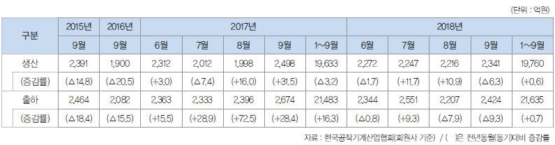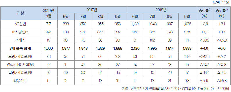 2018년 9월 공작기계 시장은 수주, 생산·출하가 증가했고, 수출은 감소했다. 내수 수주의 경우 전반적인 시장 위축, 추석연휴로 인한 조업일수 감소의 영향으로 감소세이며, 수출 수주는 미주 및 유럽 경기 호조 지속의 영향으로 반등했다.