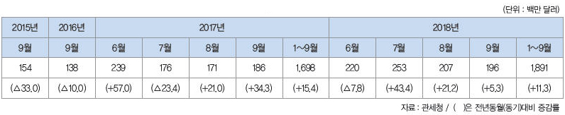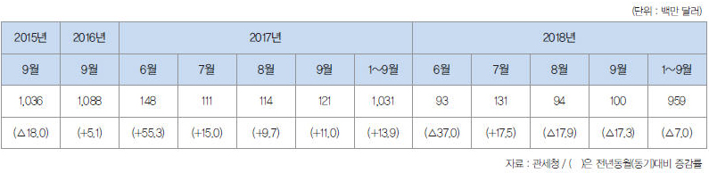 2018년 9월 공작기계 수입은 1억 달러로 전월대비 6.3% 증가했다. 전년동월과 대비해서는 17.3% 감소했다.
