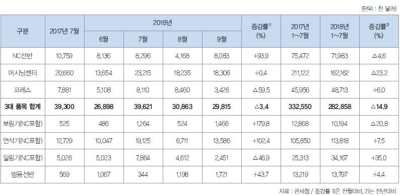 세부적으로 보면, NC선반(7,000만 달러, +2.6%)는 전월대비 증가했으나, 머시닝센터(4,300만 달러, -19.9%)는 전월대비 감소했다.