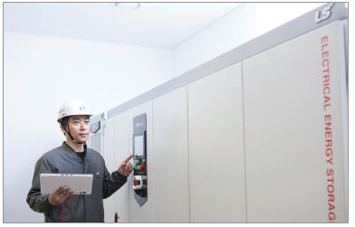 ▲ LS산전 관계자가 ESS(에너지저장장치)용 PCS(전력변환장치)를 점검하고