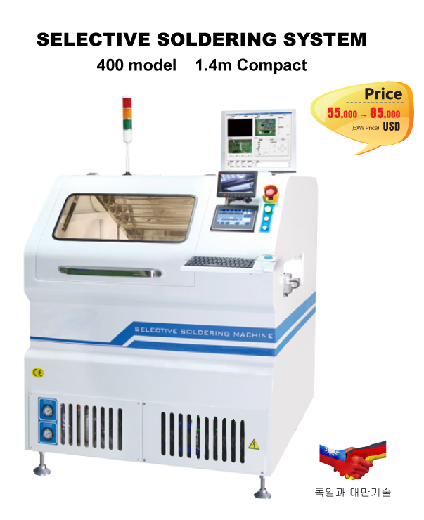 400 Series 셀렉티브 솔더링 시스템은 1.4m 넓이의 컴팩트한 사이즈로 Jet Spray Flux, Wire 솔더 공급, Port 납량 자동 측정, 2개 x 언더 카메라(under Camera)를 이용한 플럭스(Flux), 셀렉티브 솔더링 실시간 모니터링 기능을 가지고 있다. 솔더링 전 과정은 카메라와 디스플레이 화면을 통해 표시되며, 작업의 실시간 동영상과 작업 과정의 장비의 설정사항은 7주일간 저장할 수 있다.