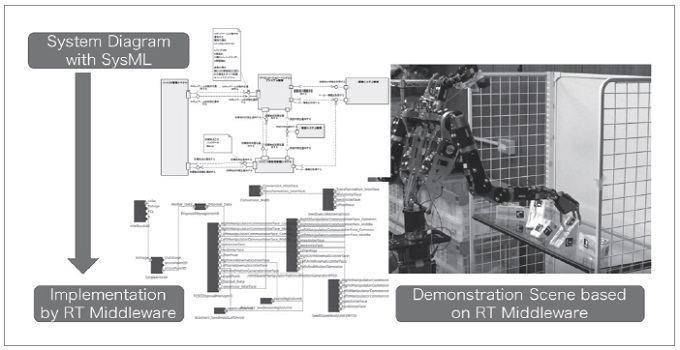 이와 같은 SysML에 의한 모델링에서 미들웨어를 이용한 실장까지 일련의 개발 프로세스를 거친 사례를 그림 2에 나타냈다. 복잡한 태스크에 대해서도 SysML의 모델로서 도식화하고 공유함으로써 여러 사람에 의한 대규모 시스템 개발에도 대응하기 쉬워진다.