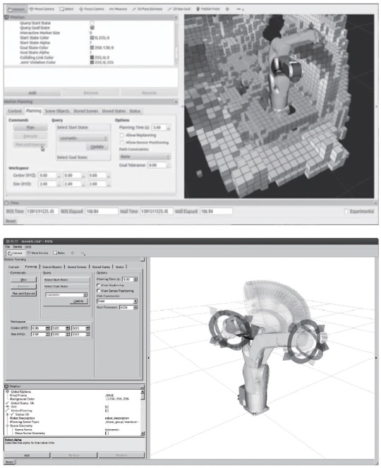 예를 들면 그림 1의 위 그림에서는 3차원 센서로 계측한 환경 정보를 rviz 툴로 표시하고 있는 모습을 나타내고 있으며, 아래 그림은 동일한 rviz 툴로 로봇의 계획 궤도를 시각화하고 있는 모습을 나타낸다. 로보틱스에서는 전자는 3차원 비전·환경 인식 등의 분야이고, 후자는 궤도 계획·로봇 플래닝 등의 분야로, 예를 들면 연구자나 개발자가 겹치는 것도 드물 만큼 동떨어진 분야인데, 그러한 분야의 격차에도 불구하고 동일한 툴을 공유할 수 있다.