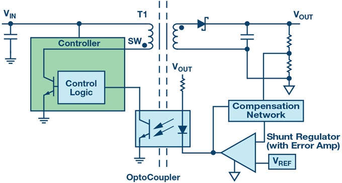 전원장치에 사용하기에 비싸지 않은 절연체로 여겨지는 옵토커플러는 전류 전달비(Current Transfer Ratio, CTR)가 변동적이라 전압 피드백 성능과 유효 동작 온도 범위를 제한한다. CTR은 입력 LED 전류 대 출력 트랜지스터 전류의 비율로서, 비선형적이며 유닛별로 상당한 차이가 있을 수 있다. 통상적으로 옵토커플러는 초기 CTR의 불명확도가 2:1이다. 그러면 고전력 고밀도 전원장치처럼 고온 환경에서 사용했을 때 수년 후에는 CTR이 최대 50%까지 떨어질 수 있다. 따라서 프로젝트 책임자의 관점에서는 디스크리트 플라이백 기법이 비용 면에서는 유리하게 생각될 수도 있으나, 요구되는 엔지니어링 작업과 기술적 위험성과의 절충을 고려해야 한다.