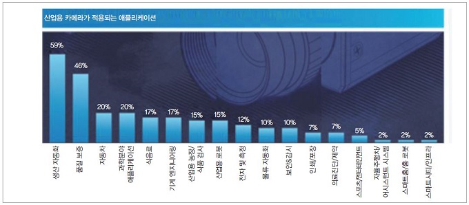이미징 기술은 주로 생산 자동화 및 품질 보증(그림 1)과 관련되어 있지만 자율주행차, 드론, 스마트홈 애플리케이션 및 스마트시티와 같은 새로운 영역에서는 구현 비율이 5%~15% 사이로 나타났다. 가장 높은 성장률은 로봇 분야로 조사됐다.