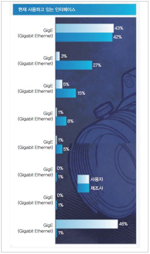 GigE Vision은 제조사와 사용자 모두에서 최고의 전송 표준으로 나타났다 각각 42% 및 43% 점유율로 조사됐다(그림 3). 아날로그 연결은 여전히 일부 사용자에 의해 사용된다. LVDS 및 HDMI는 추가로 사용되는 전송 표준이지만, USB 사용은 여전히 8%의 비율로 분명하다. 사용자와 제조업체는 모두 5Gb/s 이상의 대역폭에 대해 주로 10GigE 및 USB 3.1 표준을 선택한다.