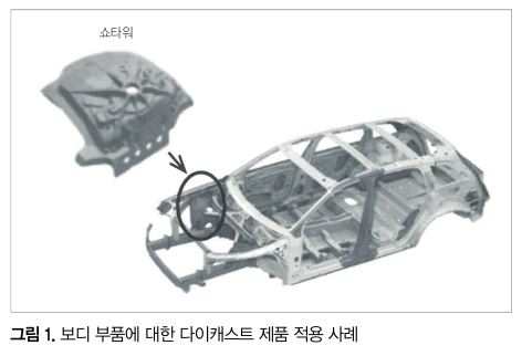다이캐스트는 복잡하고 경량의 제품을 저코스트로 제작할 수 있는 공법으로서, 기존 파워트레인을 중심으로 자동차 부품에 대한 적용이 추진되어 왔다. 또한 최근에는 그 특징을 살려 쇼타워 등 일부의 보디계 부품에도 채용 확대가 검토되고 있으며, 재료 대체(철강←알루미늄)에 의한 비강성 향상을 활용한 차량 경량화 실현에 대한 기대가 크다(그림 1).