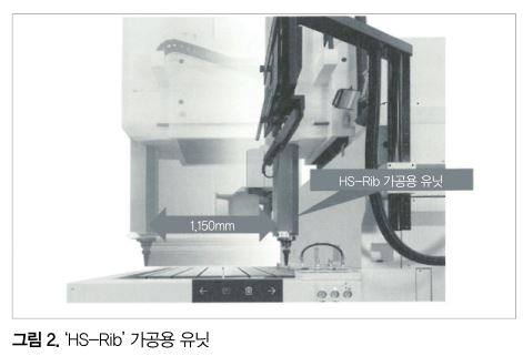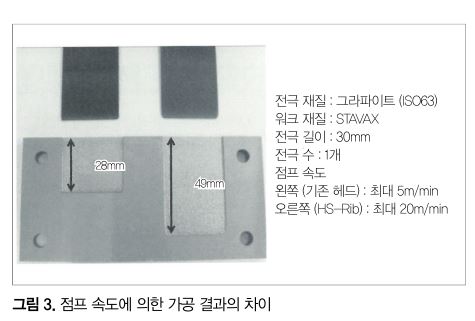 방전가공에서는 가공 중에 생성되는 가공칩의 배출 방법으로서 전극을 상하로 움직이는 점프라고 하는 기능이 있다. HS-Rib 가공용 유닛(그림 2)은 점프 속도를 고속화해 가공칩의 배출 능력을 향상시킨 헤드이다.