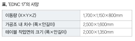 또한 Z축 방향뿐만 아니라 가로 방전가공도 이동량을 크게 함으로써 대응 가능한 범위가 대폭으로 확대됐다. 리브 형상에 따라서는 1축만의 가공이 아니라 여러 축을 동시에 움직이는 경사 방전도 많다. 가로 방전이나 경사 방전의 점프 속도도 향상시킴으로써 세팅 교체 없이 고속 가공이 가능해졌다. 기계의 사양을 표에 나타냈다.
