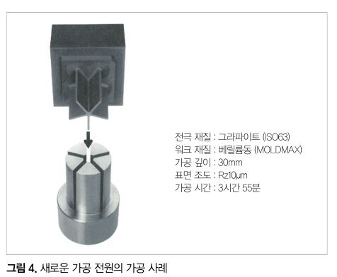 또한 표준 사양의 전류값을 크게 함으로써 에너지절감에 기여해 효율적으로 가공을 할 수 있게 됐다. HS-Rib와 새로운 가공 전원에 의한 가공 사례를 그림 4에 나타냈다. 가공 중에 불안정해지기 쉬운 난이도가 높은 동합금을 가공한 예이다. 가공 시간의 단축, 전극 수의 절감이 가능해졌다.