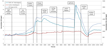 인피니언은 자체적인 일부 환경 테스트를 수행하여 실제 생활 조건에서 실내 CO2 농도를 측정했다. 정확한 실제 CO2 측정은 산업용 센서 기준에 맞춰 진행되었으며, 이는 흔히 소비자용 등급 MOX 기반 센서를 사용하여 예측하는 eCO2와는 확연히 다른 부분이다. 측정은 난로에서 나무를 태운 다음 석탄을 태우고, 주전자에 물을 끓이고, 창문을 열고 닫으면서, 요리를 하는 등 다양한 상황에서 수행되었다. 그림 3은 측정 결과를 보여준다.