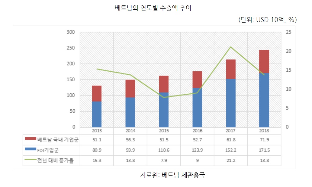반면, 베트남의 국내 기업의 총 수출액은 719억 달러(30%) 수준에 머물고 있다. 한편, 스마트폰을 필두로 한 전자제품과 ‘전화기 및 그 부분품’의 수출액은 꾸준한 성장세를 보이면서, 전화기·컴퓨터 등의 전자제품이 전체 수출액의 약 32%를 차지하고 있으며 섬유 및 신발제품은 전체 수출액의 19%를 차지했다.