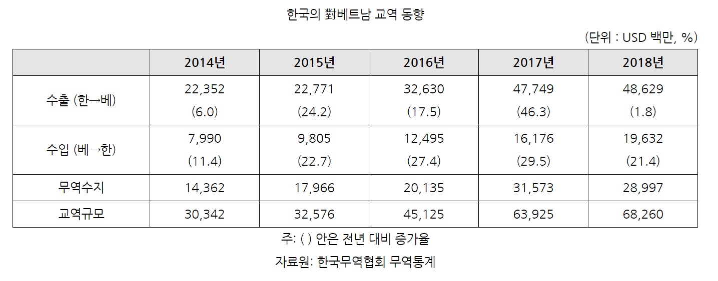 ’18년 전체 통계 기준 한국의 대베트남 수출액과 수입액은 각 486억 2천851만 달러, 196억 317만 달러로, 베트남은 한국의 3위 수출국이자, 7위 수입국이다. 무역수지는 전년 대비 8.1% 하락한 290억 달러로, 베트남은 여전히 한국에게 무역 흑자를 주는 무역 상대국의 위치에 있다.