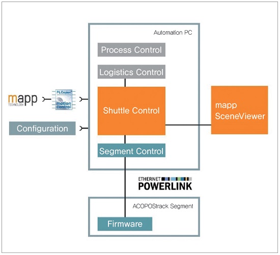 그에 따라 셔틀들은 PLCopen 명령을 이용하여 ACOPOS 서보 드라이브에 의해 구동되는 축들과 밀접하게 조정되고, Scene Viewer에서 디지털 쌍둥이처럼 표시된다.