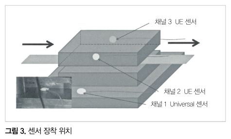 대상으로 한 것은 고속 스탬핑 프레스의 순차이송 가공 공정이다. 금형 치수는 W 300×D 200으로, 브로티드 슬래그 검지를 위해 스트리퍼 플레이트에 UE 센서(진동 센서)를 2개, 하측 다이셋에 Universal 센서(하중 센서)를 1개 접착제로 붙였다(그림 3). 양품이 생산되고 있는 상태의 파형을 모니터링 유닛에 기억시키고, 슬래그를 재현하기 위해 여러 가지 치수 두께의 심(스테인리스재)과 실제 제품 재료인 동합금재를 금형 내에 투입해 파형을 비교했다.