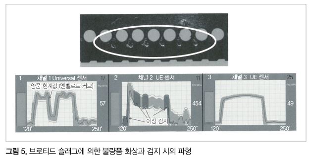 취득한 파형을 그림 4에 나타냈다. 양품 시의 파형과 비교해 공통적으로 크게 변화가 나오고 있는 것은 채널 1의 Universal 센서와 채널 2의 UE 센서이다. 슬래그의 투입 위치에 따라 파형 변화가 큰 부위가 있다는 것을 알 수 있다. 또한 심의 두께나 치수가 크고 두꺼워지면, 센서 파형의 변화도 커진다는 것을 알 수 있다.