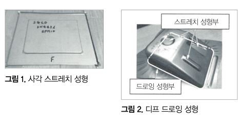 금형 다이세트와 프레스기 사이에 압력 검출 플레이트를 설치, 압력 플레이트 내에 50mm 간격으로 매립한 17개의 변형 게이지가 있는 볼트에 의해 그 점의 압력을 측정했다. 프레스 성형 실험에서는 그림 1에 나타낸 사각 스트레치 성형과 그림 2에 나타낸 디프 드로잉 성형을 했다.