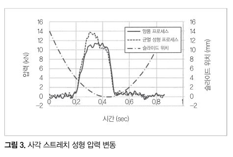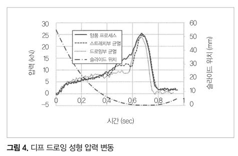 디프 드로잉 성형품은 하나의 드로잉 성형부 중에 3개의 스트레치 성형부를 가지고 있다. 그림 3은 다른 재료를 이용한 사각 스트레치 성형에서 양품 성형 프로세스와 균열 발생 성형 프로세스의 압력 플레이트 중 하나의 볼트에 주어지는 압력의 거동을 나타내고 있다.