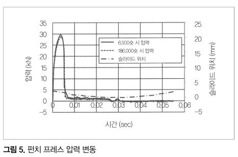 그림 5는 6,500숏 시와 186,000숏 시의 펀치에 작용하는 1숏 간의 압력 변동을 나타내고 있다. 6,500숏 시의 해당 부분의 버 높이는 0.06mm와 0.03mm였다. 186,000숏 시의 해당 부분의 버 높이는 0.12mm와 0.19mm였다.
