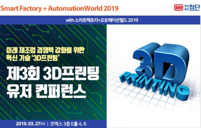 제3회 3D프린팅 유저 컨퍼런스 2019가 ‘스마트팩토리+오토메이션월드 2019’ 전시회가 열리는 오는 27일(수) 코엑스 컨퍼런스룸에서 개최된다.
