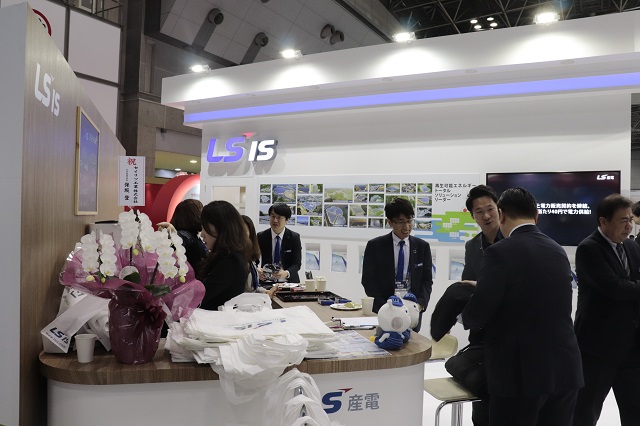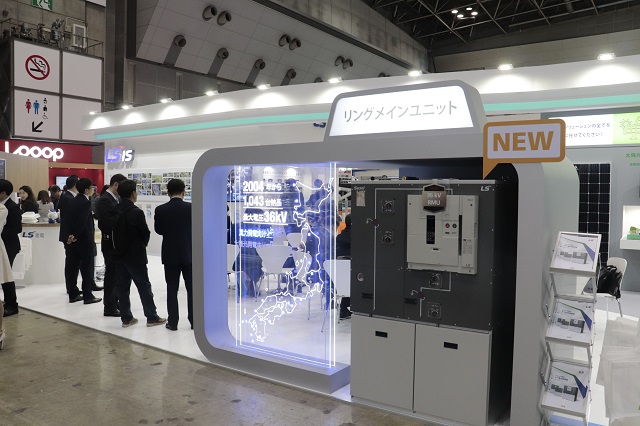 LS산전은 PV EXPO 전시장 안에 부스를 마련했다. 부스는 총 16.2부스(145.8㎡) 규모로 입구에서 쉽게 찾을 수 있는 곳에 위치해 있었다. 이 부스에는 ▲스마트 발전 솔루션 ▲스마트 직류(DC) 솔루션 ▲스마트 에너지 최적 관리 등 3개 테마를 중심으로 36kV 전력개폐장치(RMU; Ring Maun Unit), 수상 태양광 전용 모듈, 직류(DC) 전력기기 신제품, 초고압직류송전(HVDC; High Voltage Direct Current)등 일본 스마트 에너지 시장 주도권 강화를 위한 핵심 솔루션을 전시했다.