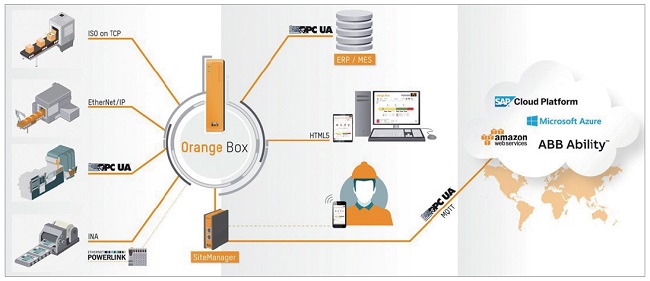 기존의 공장들은 기계 데이터를 자동으로 수집하는 방법이 어렵기 때문에 B&R이 Orange Box를 개발했다. 사용자가 여러 라인, 위치 및 대륙으로부터 수집된 데이터를 비교할 수 있도록 B&R은 클라우드 인터페이스에 Orange Box를 장착한다.