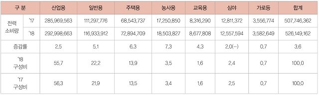전력 판매단가는 108.7원/kWh으로, 2017년 전력 판매단가(109.5원/kWh)보다 0.7% 하락했다. 전력사용 용도별로 구분하면 전력사용 비중(총 95.3%)이 큰 주택(가정)용 1.6원, 산업용 0.9원, 일반(상업)용 0.4원, 농사용 0.2원으로 낮아졌다. 반면, 상대적으로 전력사용 비중(총 4.7%)이 적은 교육용은 1원, 가로등은 0.3원, 심야는 0.1원 상승했다.
