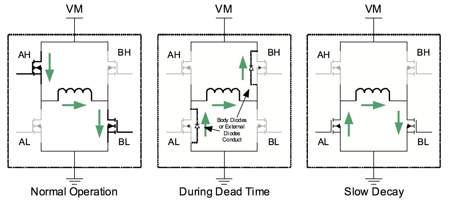 ▲ 그림 2b: 느린 감쇠일 때 H 브리지 전류 흐름 (출처 : 텍사스 인스트루먼트)