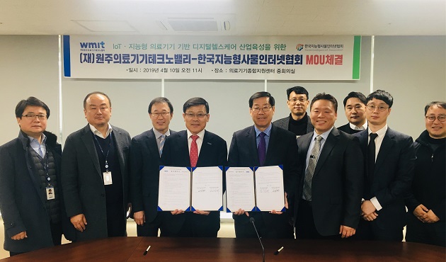 한국지능형사물인터넷협회(이하 사물인터넷협회)와 원주의료기기테크노밸리(이하 테크노밸리)는 헬스 및 의료 부문에서의 사물인터넷 응용서비스 확산을 위한 상호 협력을 위해 4월 10일 의료기기종합지원센터에서 업무협약을 체결하였다.