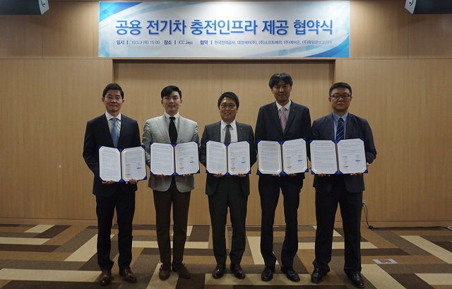 한국전력(대표이사 사장 김종갑)이 9일, 제주 국제전기차 엑스포 행사장에서 4개 전기차 충전서비스 사업자와 ‘한전 공용충전기 제공 및 이용 협약’을 체결했다.