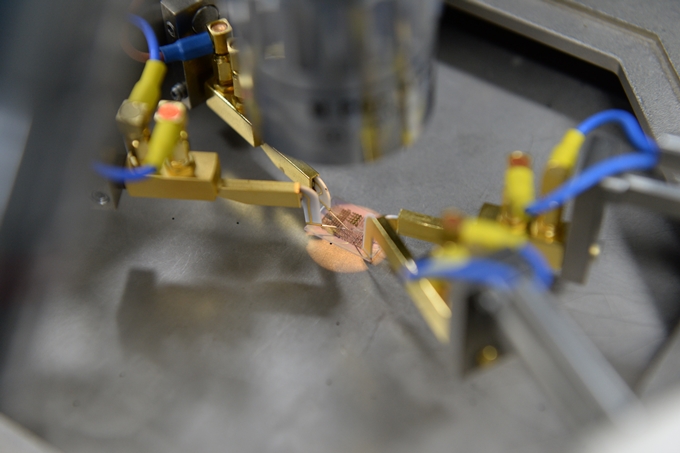 ▲ ETRI 연구진이 공정이 완료된 산화갈륨 전력반도체 온-웨이퍼 측정 모습