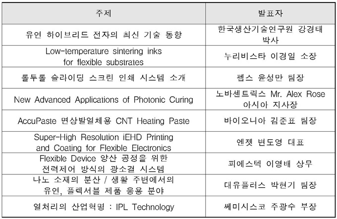 워크숍 주제는 ‘Flexible Material & Device For Future Electronics’이다. 이번 워크숍에서 한국생산기술연구원 강경태 책임은 ‘유연 하이브리드 전자의 최신 기술동향’에 대해 발표할 예정으로, 이 발표를 시작으로 인쇄전자 전문가들이 발표가 이어질 예정이다.