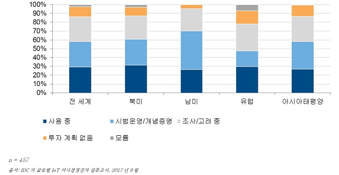 또한 IDC의 2017 글로벌 IoT 의사결정권자 설문조사(Global IoT Decision Maker Survey)에서는 소매업체의 거의 60%가 자산 추적 및 관리를 위해 IoT를 시범운영 중이거나 실제로 사용하고 있다고 답했다. 흥미로운 점은 전 세계 대부분의 지역에서 25~30% 정도가 이 기술의 시범운영 및 개념증명에 투자하고 있는 것으로 일관되게 나타나고 있지만, 남미의 경우 거의 45% 가량이 이 기술에 투자하는 등 시장을 선도하고 있다는 사실이다. 이는 다른 지역(17.5~31.5%)에 비해 월등히 높은 수치다(그림 1 참조).