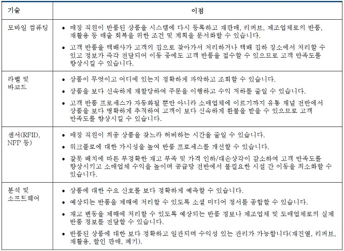 표1. 공급망을 위한 반품 관리 기술의 이점