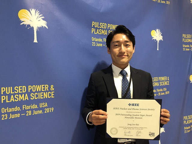 배정수 학생은 ‘모듈형 고밀도 펄스전원 기술’과 관련한 발표 논문이 세계 펄스파워 전문가로부터 높은 평가를 받은 공로를 인정받아 수상한 것으로 알려졌다.
