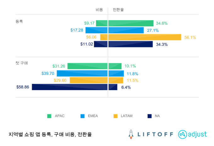 애드저스트와 리프트오프는 이번 보고서를 통해 유저들이 소매 앱을 손쉽게 설치하고 등록하지만 주요 구매 단계의 수치가 하락했다고 밝혔다. 아시아 태평양 지역의 경우, 첫 구매 당 비용은 31.26 달러(한화 약 3만 6천 6백원)로 전년 대비 13.3% 상승했으며, 전환율은 10.1%로 저조했다. 구매 당 비용 상승과 평이한 전환율은 구매에 대한 권한을 갖고 교육을 받은 지능적인 소비자들이 있는 고도화되고 경쟁적인 시장에서 흔히 일어나는 현상이다.