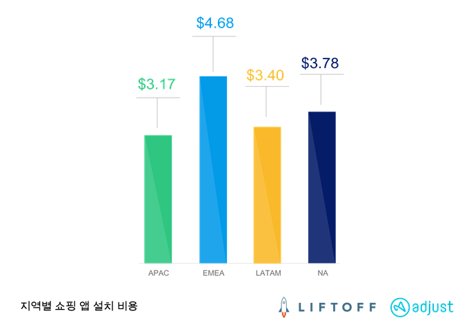 이에 따라, 쇼핑 앱 유저를 모객하는 것이 과거에 비해 훨씬 용이 해졌으며, 유저들 역시 쇼핑 앱에 활발하게 관여하고 있다. 아시아 태평양 지역의 경우, 앱 등록을 완료한 유저 모객 비용은 9.17달러(한화 약 1만 7백 원)으로 전년 대비 52% 감소했다. 또한, 쇼핑 앱 설치당 비용은 3.17달러(한화 약 3천 7백 원)으로 유럽, 중동, 아프리카, 북미, 남미 포함 전 세계에서 가장 낮은 것으로 나타났다.