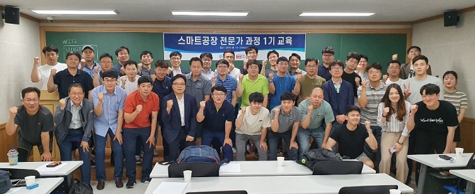 스마트공장 전문가 과정 1기 교육생들이 전 과정을 마치고 기념촬영을 하고 있다.