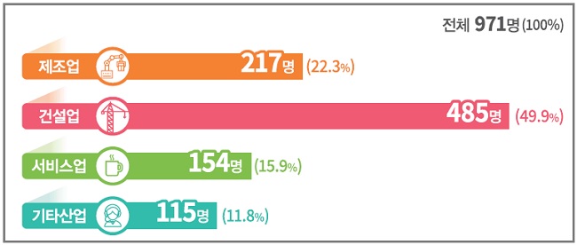 사업장 규모별 사고사망자 발생률 또한 50인 미만 사업장이 전체 79%를 차지해 중소 사업장일수록 작업 환경이 열악하고 산업 안전 기준이 잘 지켜지지 않은 것으로 나타났다.
