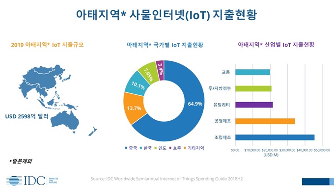 IT 시장분석 및 컨설팅 기관인 인터내셔날데이터코퍼레이션코리아(International Data Corporation Korea Ltd., 이하 한국IDC)는 전세계 사물인터넷(IoT) 지출가이드 보고서(IDC Worldwide Semiannual Internet of Things Spending Guide)에서 일본을 제외한 아태지역이 2019년 전세계 IoT 지출의 35.7%로 지출이 가장 큰 지역이 될 것으로 전망했다.