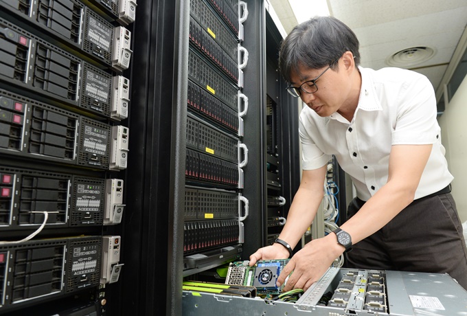 ▲ ETRI 최용석 책임연구원이 서버에 메모리박스를 장착하는 모습