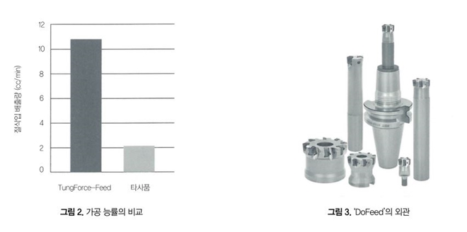 DoFeed(그림 3)는 공구 지름 Ø16~200mm의 넓은 공구 지름 레인지에 대응하는 고이송 공구이다. 다날 설계 보디와 금형가공에 적합한 인서트에 의해 높은 가공 능률과 안정된 공구 수명을 제공한다. DoFeed의 주된 특징을 이하에 나타냈다.
