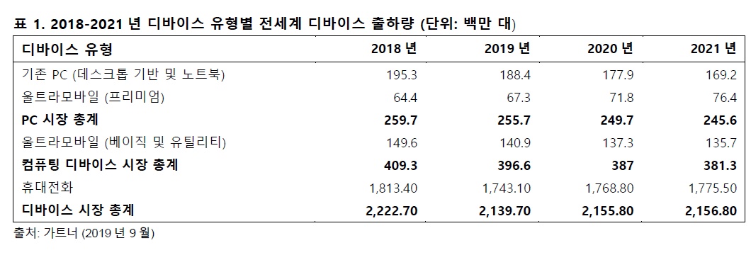 세계적인 IT 자문기관 가트너(Gartner)가 2019년 전세계 디바이스 출하량의 업데이트 전망치를 발표했다. 가트너에 따르면, 2019년 PC, 태블릿, 휴대전화를 포함한 디바이스의 전세계 출하량은 전년 대비 3.7% 감소할 것으로 예상된다.