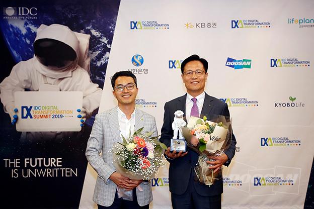 ▲ ‘IDC DX Awards 2019’ 시상식에서 두산중공업 손우형 상무(오른쪽)가 ‘DX Leader’로 선정되어 수상 후 기념촬영을 하고 있다.