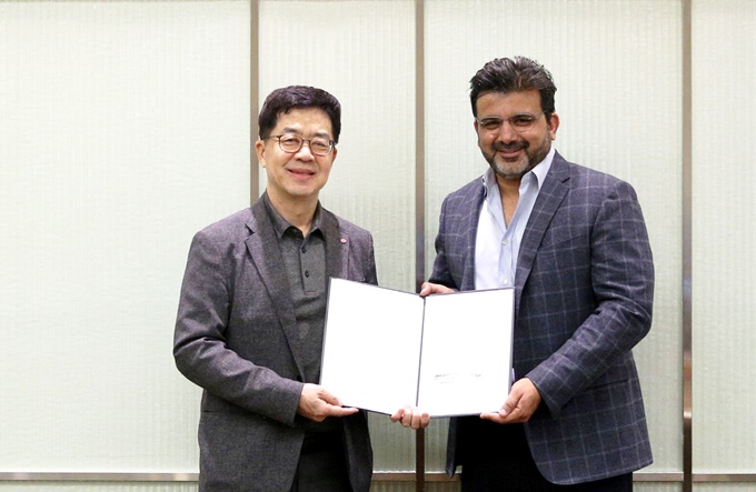 ▲ LG전자 CTO 박일평 사장(왼쪽)과 퀄컴 제품 관리 수석부사장 나쿨 두갈(Nakul Duggal)이 webOS Auto 연구개발과 생태계 확대를 위한 사업협력(MOU)을 맺었다.