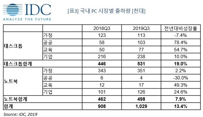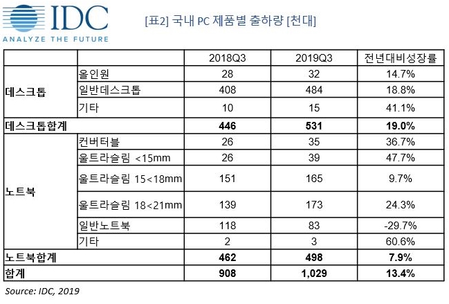 IT 시장분석 및 컨설팅 기관인 인터내셔날데이터코퍼레이션코리아 (International Data Corporation Korea Ltd., 이하 한국IDC)의 국내 PC 시장 연구 분석에 따르면, 2019년 3분기 국내 PC 출하량은 데스크톱 53만대, 노트북 49만대, 합계 102만대로 전년 대비 13.4% 증가했다.