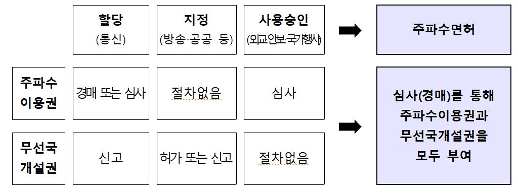 주파수를 이용하려는 자는 주파수 이용 권한과 더불어 그 주파수를 활용한 무선국의 개설 권한을 확보해야 하는데 현행 제도(주파수 할당‧사용승인‧지정)는 주파수 이용과 무선국 개설에 있어 서로 다른 규제체계를 적용하여 복잡하고 전파 수요자가 이해하기 어려운 문제가 있었다.