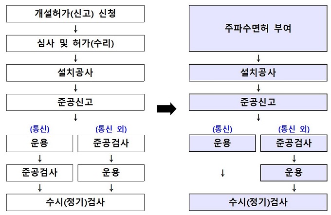 주파수면허 부여 심사사항에 무선국 개설 관련 내용이 포함됨에 따라 주파수면허를 받은 자는 기존의 무선국 개설 허가‧신고(수리를 요하는 신고) 절차 없이 무선국을 개설할 수 있다. 또한 포괄적 네거티브 규제개선의 일환으로, 동일 제원의 무선국을 다량으로 설치하는 통신주파수면허에 대해 무선국 개설 후 준공검사를 받는 대신 무선국을 개설한 자가 해당 무선국 운용이 적합함을 증명하는 서류를 제출하는 것으로 갈음하는 제도를 도입한다.