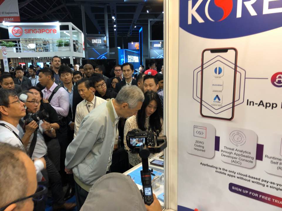 ▲ 2019 싱가포르 핀테크 페스티벌에 참가한 원투씨엠 부스를 방문해 원투씨엠의 서비스에 대한 설명을 경청하는 리센룽 싱가포르 총리